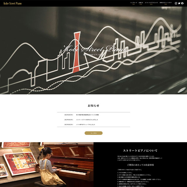 Website神戸市内各所に設置された、自由に弾いていただける「ストリートピアノ」に関する情報発信のHPデザイン・CMS制作