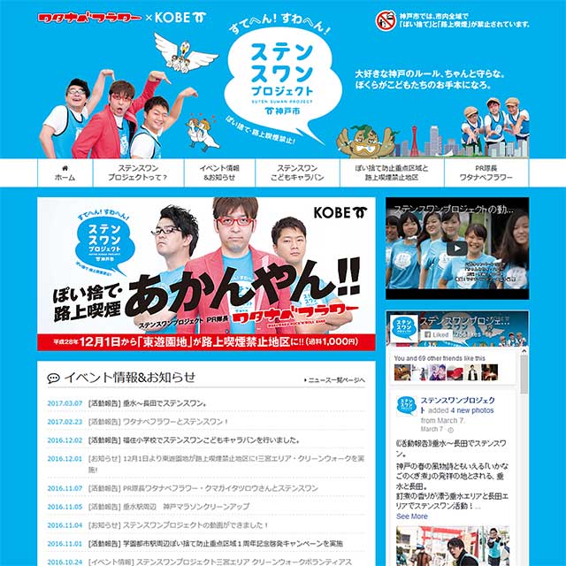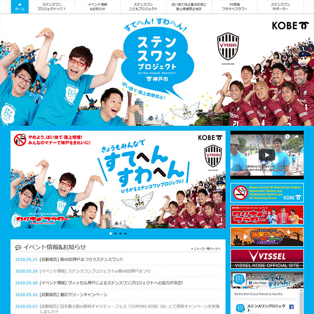 Website神戸市環境局の事業「ぽい捨て禁止」、「路上喫煙禁止(努力義務)」を啓蒙する「ステンスワンプロジェクト」運動のHP・CMS制作。